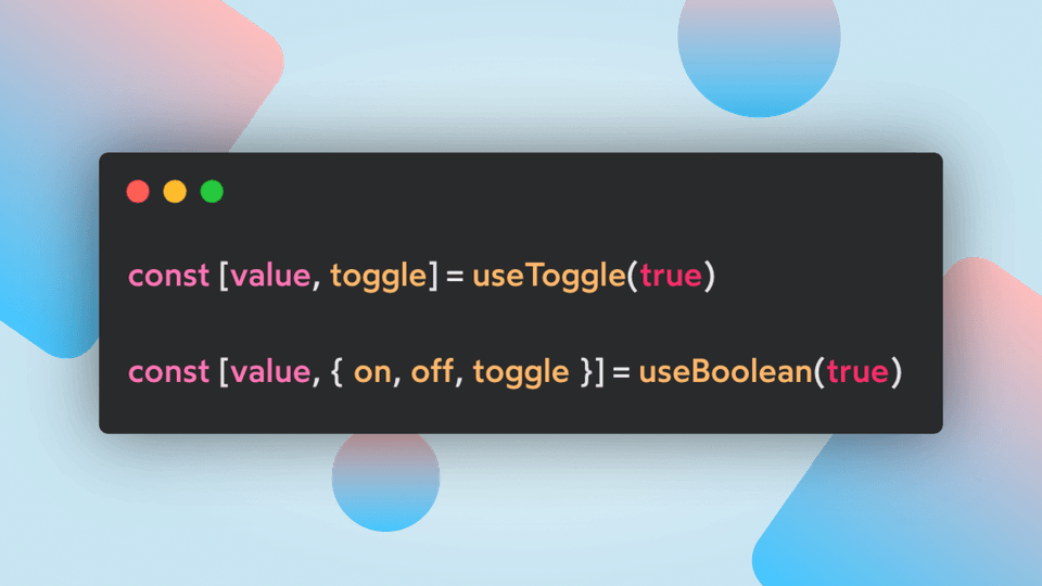 Similarly to useToggle, it returns an array that holds as the first element the value, and as the second argument it returns an object with all the possible handlers that allow setting the boolean: